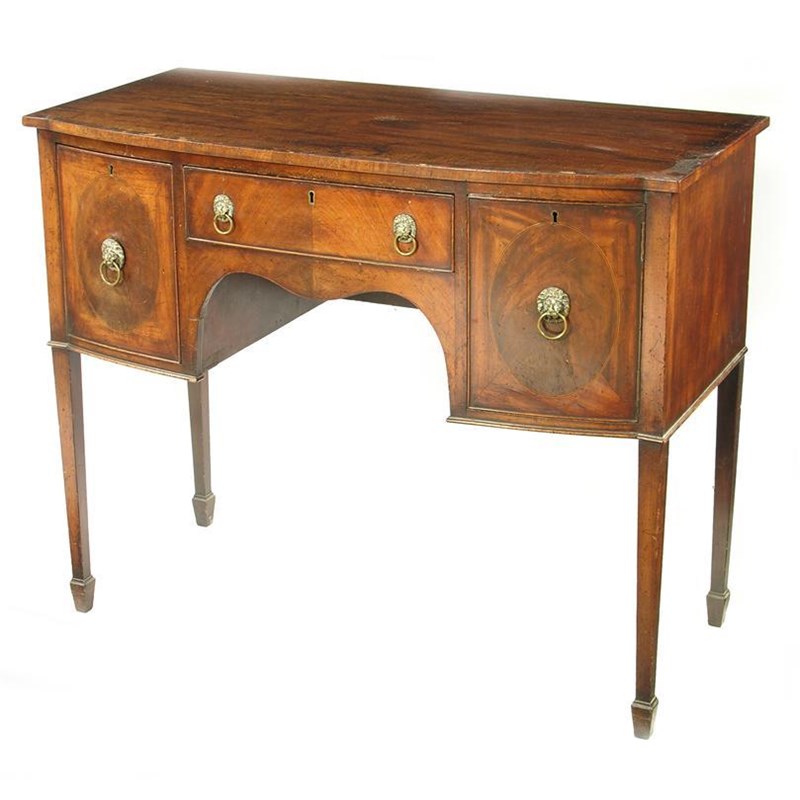 A Regency style mahogany bowfront sideboard, the crossbanded top above a central drawer, a deep cellaret drawer and a cupboard door all fitted brass lion's mask handles, on square tapering legs to spade feet, 33.75in (85.9cm) h, 41.5in (105.4cm) w, 20.25in (51.4cm) d. With glass top.