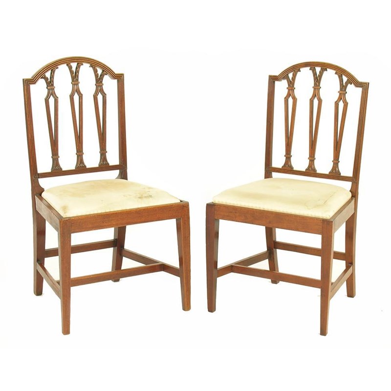 A set of seven mahogany Hepplewhite dining chairs, the reeded arched frames with pierced triple splats having drop in seats on square tapering legs united by 'H' stretchers, comprising: a single open armchair and six side chairs. (7) One side chair with back broken.