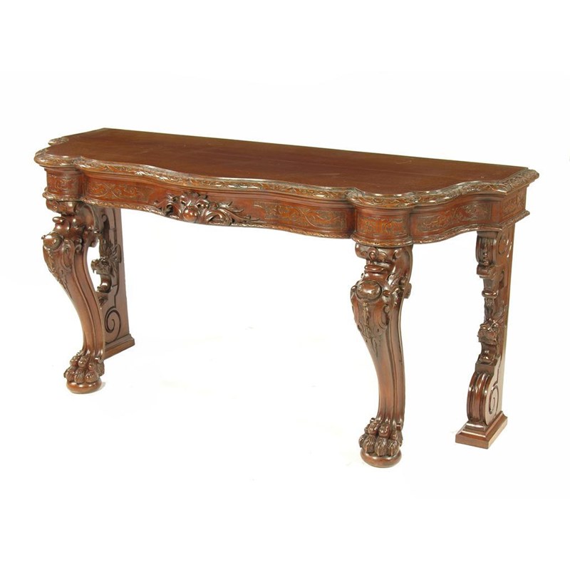 A Victorian Irish carved oak serving table, the shaped front top with later veneer to a strapwork and floret edge to a foliage carved panel frieze with a central cabouchon issuing leafage, on conforming cabriole legs to hairy paw feet and back supports carved beast masks, 36.25in (92cm) h, 73in (185cm) w, 26.5in (67cm) d.