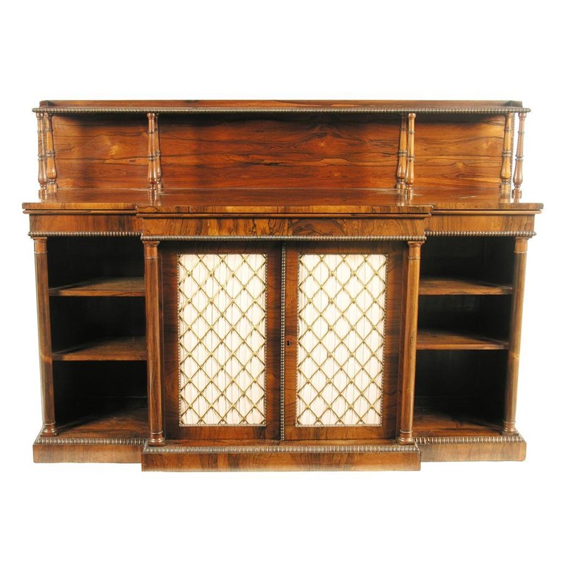 A Regency rosewood breakfront chiffonier, with nulled edges, the 3/4 galleried top supported by ring and baluster turned columns, above a pair of pleated fabric and brass grille doors enclosing shelves, flanked by open shelves, and turned columns, on a plinth base, 49in (124.6cm) h, 67in (170cm) w, 17.5in (44.4cm) d.
