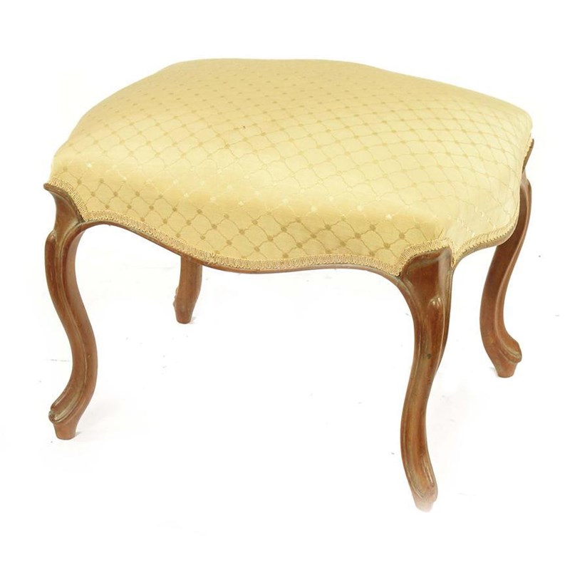 A Victorian walnut stool, of serpentine outline, the upholstered top on moulded cabriole legs, 20.5in (52cm) h, 27in (68.5cm) w, 21.5in (54.3cm) d.