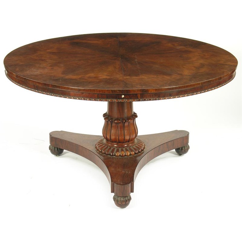 A George IV rosewood centre table, the circular tilt-top with a figured radiating veneer above a reel and dart applied moulded frieze on a turned stem with leaf carved bowl and ribbed edge the triform base with part ribbed turned feet the brass castors stamped 'C. Cope Patent,' 28in (71cm) h, 52in (132cm) dia.