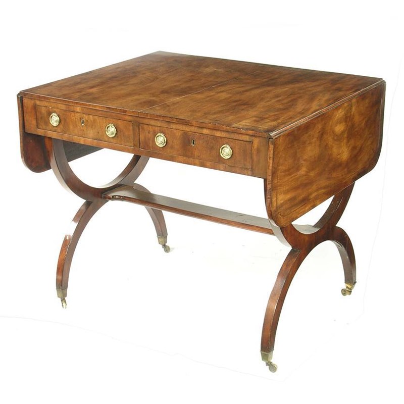 An early 19th century mahogany sofa table, the twin flap top above two frieze drawers fitted replaced brass handles, with dummy to the reverse on 'X' shape supports united by a solid stretcher on brass caps and castors, 28.75in (73cm) h, 34.5in (87.4cm) w, 28in (71.2cm) d. Top cracked.