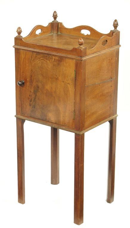 A 19th century mahogany bedside cupboard, the galleried top with pierced handgrips and turned finials, two later, above a panel door enclosing a shelf, 32.75in (83cm) h, 13.75in (35cm) w, 11.25in (28.5cm) d.
