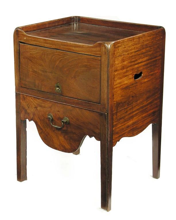 A George III mahogany 'tray top' bedside commode, the sides with pierced handgrips to a pull down cupboard door fitted a brass sunken handle, the pull-out base with a pierced aperture and turned lid, shaped apron and brass handle, on moulded supports, 31in (78.5cm) h, 22in (55.8cm) w, 19.5in (49.5cm) d.