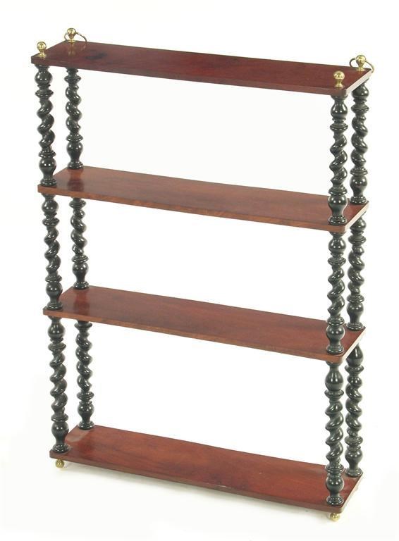 A set of early Victorian mahogany hanging shelves, with brass finials and ring hooks and spiral turned ebonised supports, 29in (73.5cm) h, 20.25in (51.5cm) w, 5in (12.5cm) d.