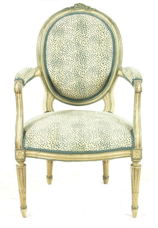 A Louis XVI style beechwood and painted fauteuil, the carved floral crest to an oval padded back and open scroll arms, the bowfront seat on fluted tapering legs.