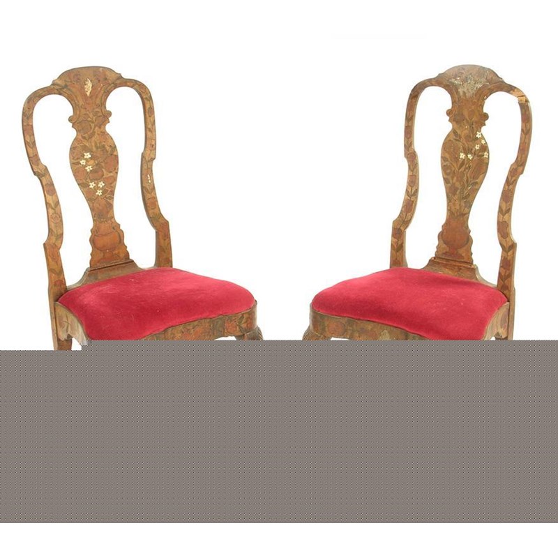 A set of four 18th century Dutch marquetry side chairs, each with a shaped top rail above a vase shape splat decorated a bird amongst flowers issuing from an urn, to a later drop-in seat on shell carved cabriole legs to pad feet. (4) Losses to veneer and inlay, wormed, old damages, in need of restoration.