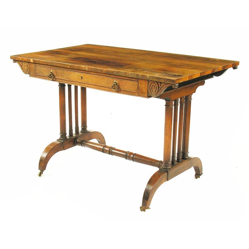 A George IV rosewood sofa table, the reduced rectangular top above a frieze drawer flanked by scroll volutes on turned end supports united by a turned stretcher on scroll legs to brass castors, 28.25in (72cm) h, 44in (112cm) w, 26.75in (68cm) d.