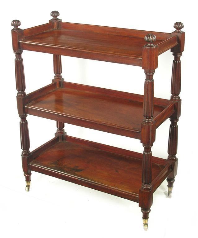 A Victorian mahogany three tier buffet, with lobed finials and 3/4 galleries, on reeded uprights to brass castors, 43.5in (110.5cm) h, 34.75in (87.8cm) w, 17.25in (43.7cm) d. Castors possibly replaced.