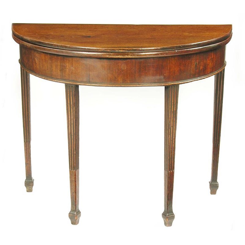 A George III mahogany demi-lune tea table, the hinged top above a plain frieze on square tapering stop fluted legs to spade feet, 28.75in (72.7cm) h, 35.25in (89.5cm) w, 17.25in (43.6cm). Support mechanism now fixed, old worm holes.