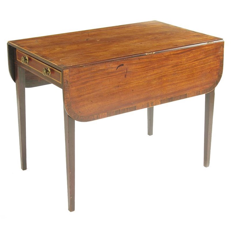 An early 19th century mahogany and line inlaid Pembroke table, the twin flap top with rosewood banding above a frieze drawer fitted brass handles embossed a flower head on square tapering legs, 27.75in (70.5cm) h, 22.5in (57.1cm) w, 35.75in (91.2cm) d.