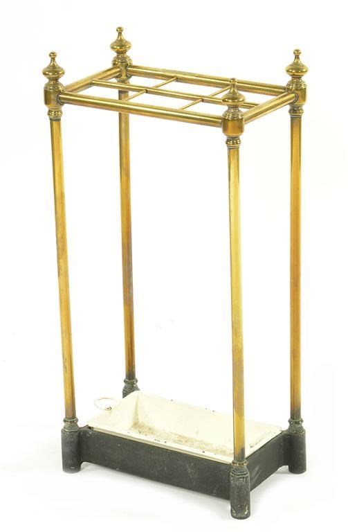 A turned brass and cast iron six division stick stand, with lift-out tray, early 20th century, 24.5in (62.5cm) h, 12in (30.8cm) w, 7.25in (18.5cm) d.