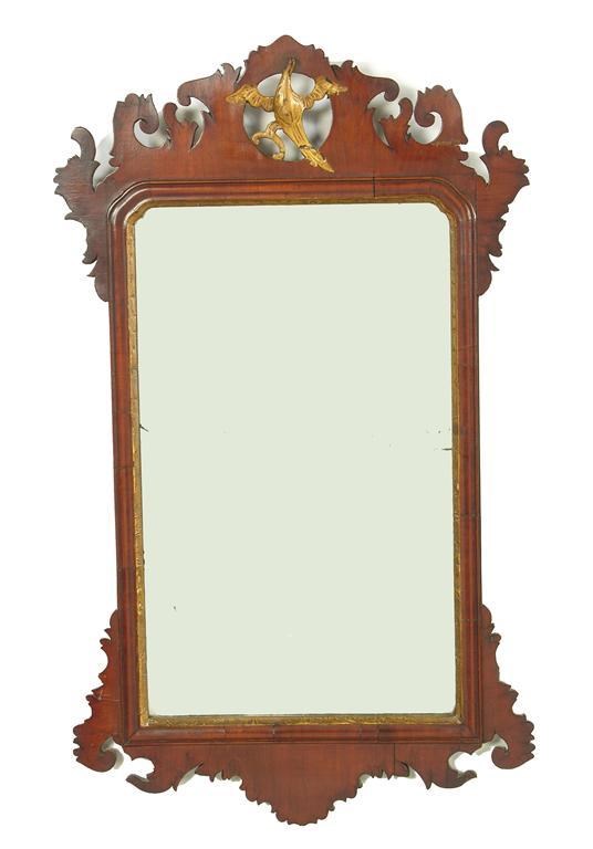 A George III mahogany and parcel gilt fret frame wall mirror, with a re-silvered bevelled plate, the pierced surmount centred a ho-ho bird, 30.5 x 18in (77.5 x 46cm). Repairs and losses.