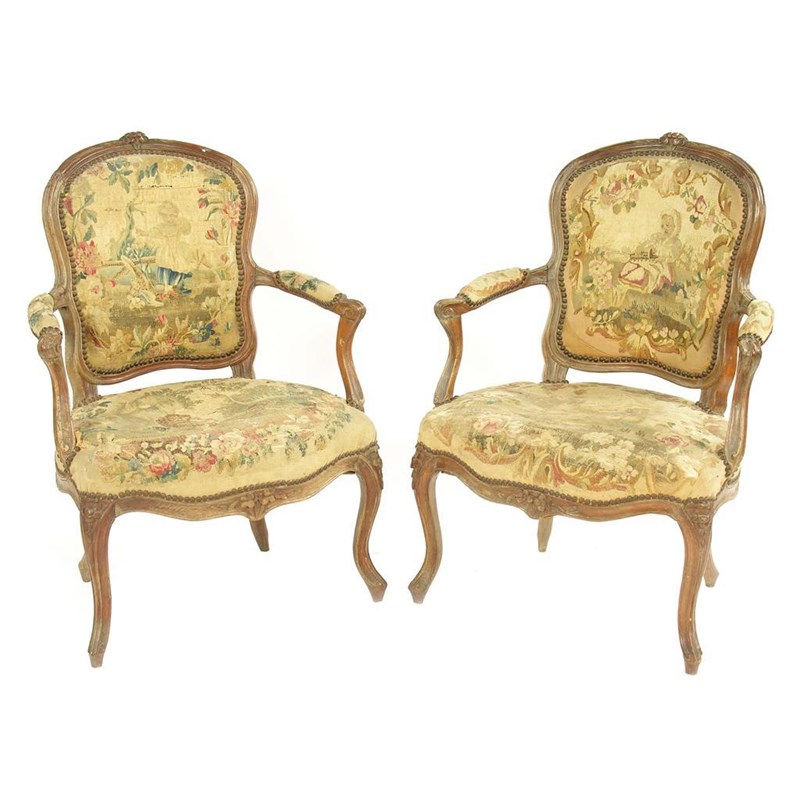 A near pair of Louis XVI provincial beechwood fauteuil, with carved and moulded frames, each with a tapestry upholstered back, arms and seat, on front cabriole legs. (2)