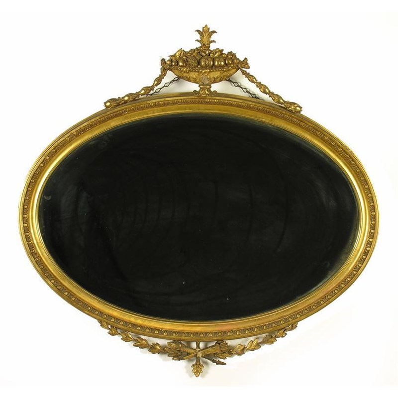 A late Victorian oval giltwood and gesso wall mirror, with a bevelled plate and an urn of fruit surmount to a crossed flaming torch and quiver base, 32.5 x 33.5in (82.5 x 85cm).