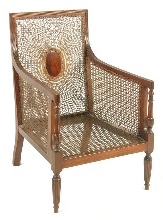 An Edwardian mahogany and caned bergere, with a reeded frame and ribbed turned supports. Caning defective.