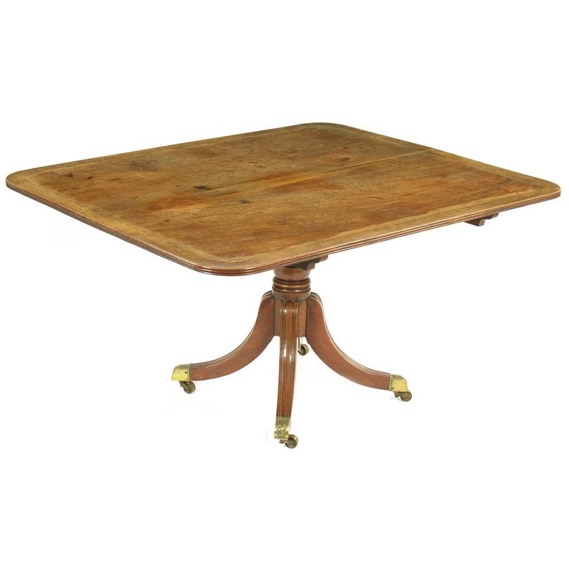 A George IV mahogany breakfast table, the rectangular crossbanded tilt-top with a reeded edge on a ring turned stem to four moulded scroll legs with cast vine brass sabots and castors, 29in (73.5cm) h, 44.25 x 54in (112.5 x 137cm).
