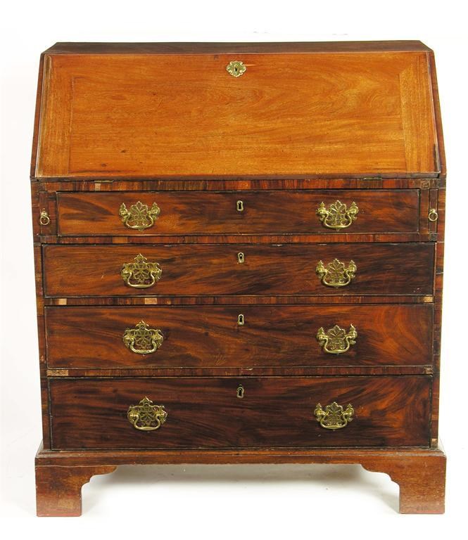 A late George III mahogany bureau, the interior with pigeon holes and drawers fitted turned bone handles above four long graduated drawers fitted later pierce brass plate handles on bracket feet, 42in (106.5cm) h, 37.5in (95.5cm) w, 21.25in (54cm) d.