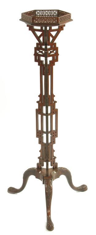 A 'Chinese Chippendale' style mahogany torchere, the hexagonal top with a fretwork gallery on a triform fretwork stem and carved tripod cabriole legs to pad feet, 50.25in (127.4cm) h, 22.75in (58cm) w.
