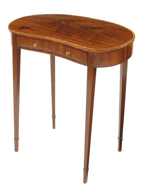 An early 19th century mahogany kidney shape writing table, the satinwood banded top above a frieze drawer with divisions for inkwells and a pen tray, on square tapering legs, 28in (71.2cm) h, 26.5in (67.5cm) w, 14.5in (37cm) d. Restorations and replacements, top warped.