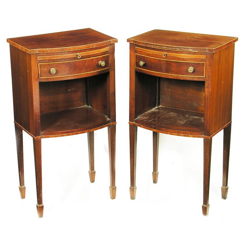 A pair of mahogany bedside tables, inlaid boxwood stringing, each with a brushing slide above a drawer, on square tapering legs to spade feet, early 20th century, 29.5in (75.2cm) h, 16in (40.4cm) w, 12in (30.5cm) d. (2) One with a large crack to the front edge.