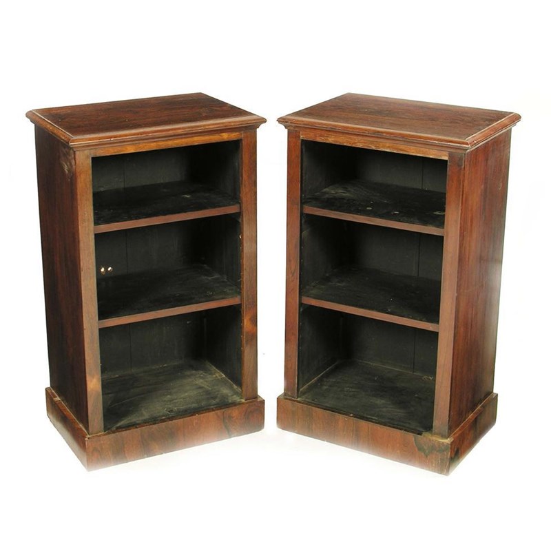 A pair of Victorian rosewood low bookcases, each with a moulded edge top and two adjustable shelves on a plinth base, 31in (78.5cm) h, 18.5in (46.8cm) w, 13in (33cm) d. (3) Some minor veneer loss.