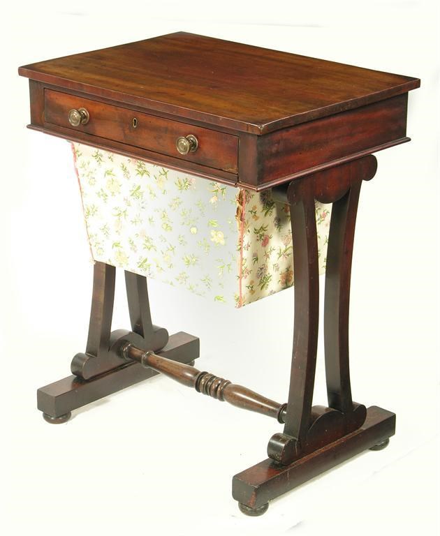 An early Victorian mahogany work table, the rectangular top above a drawer, and a dummy drawer to the reverse, a pull-out bag, on pierced scroll trestle ends united by a turned stretcher on disc feet, 29.25in (74.3cm) h, 24in (61.1cm) w, 17.75in (45.2cm) d.