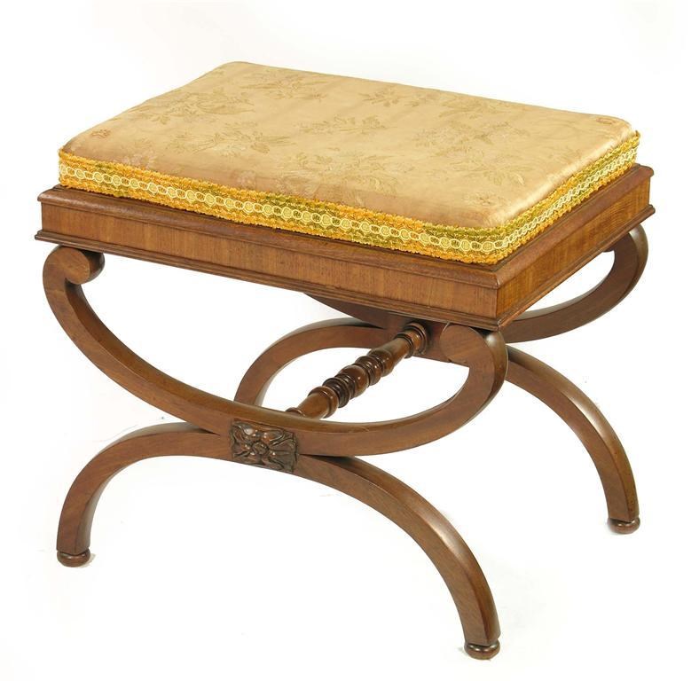 An early 19th century mahogany foot stool, the drop-in seat on 'X' shape supports united by a turned stretcher, with applied carved rosettes, on flattened bun feet, 21in (53.2cm) h, 22.25in (56.6cm) w, 16in (42.5cm) d.