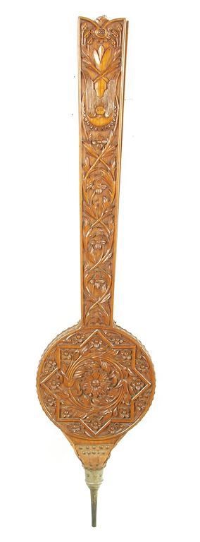 A large pair of Irish walnut bellows, carved with a bird amongst flowers and foliage, the back with stencilled initials 'W.C.H', 60in (153cm) h.