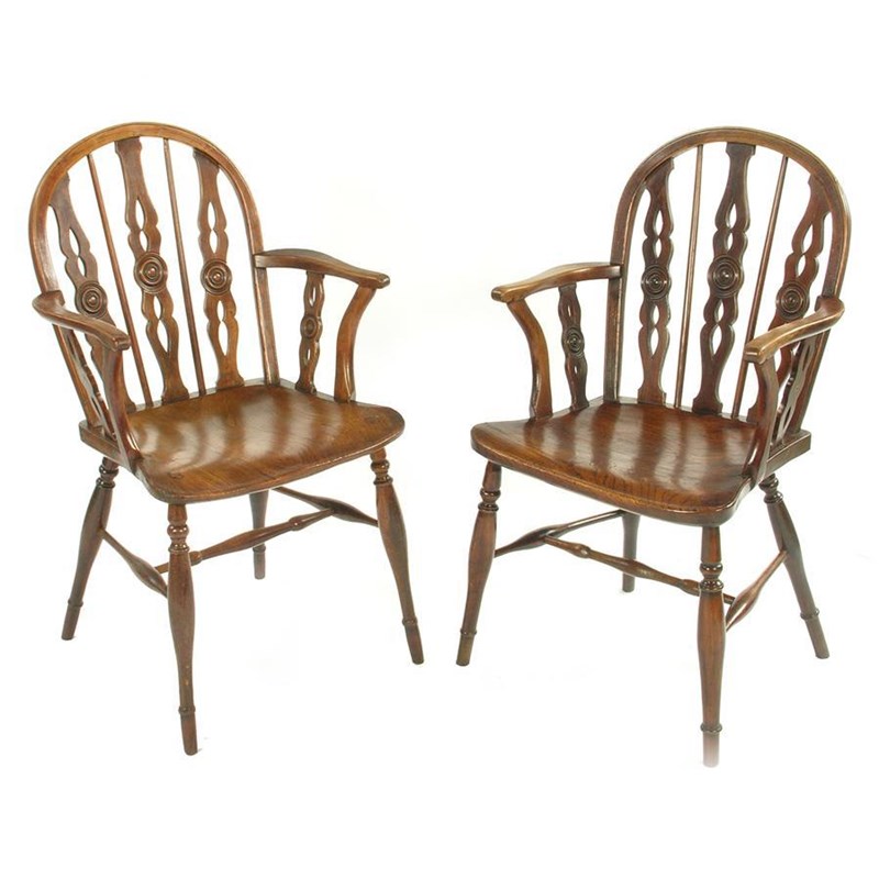 A pair of 19th century ash and elm Windsor armchairs, in the manner of Robert Prior of Uxbridge, each with a hooped back, triple pierced splat with rondel motifs on turned tapering stretchered supports. (2)