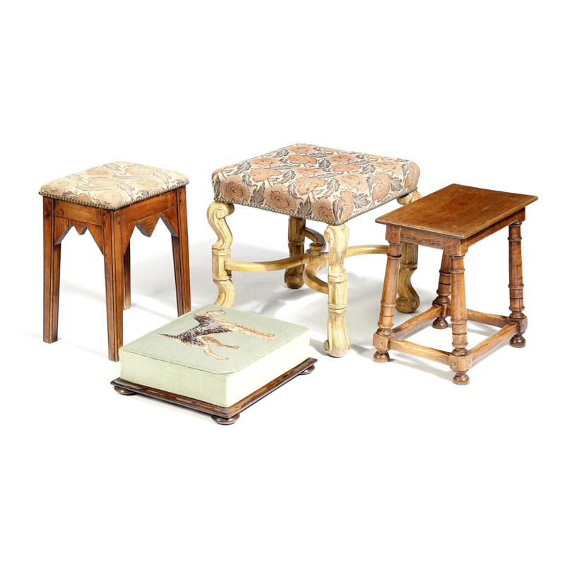 λ A Victorian rosewood stool, the needlework seat decorated with an Airedale terrier, an early 18th century style stool and two other stools in pine and walnut, 49.7cm high, 49cm wide (max). (4)