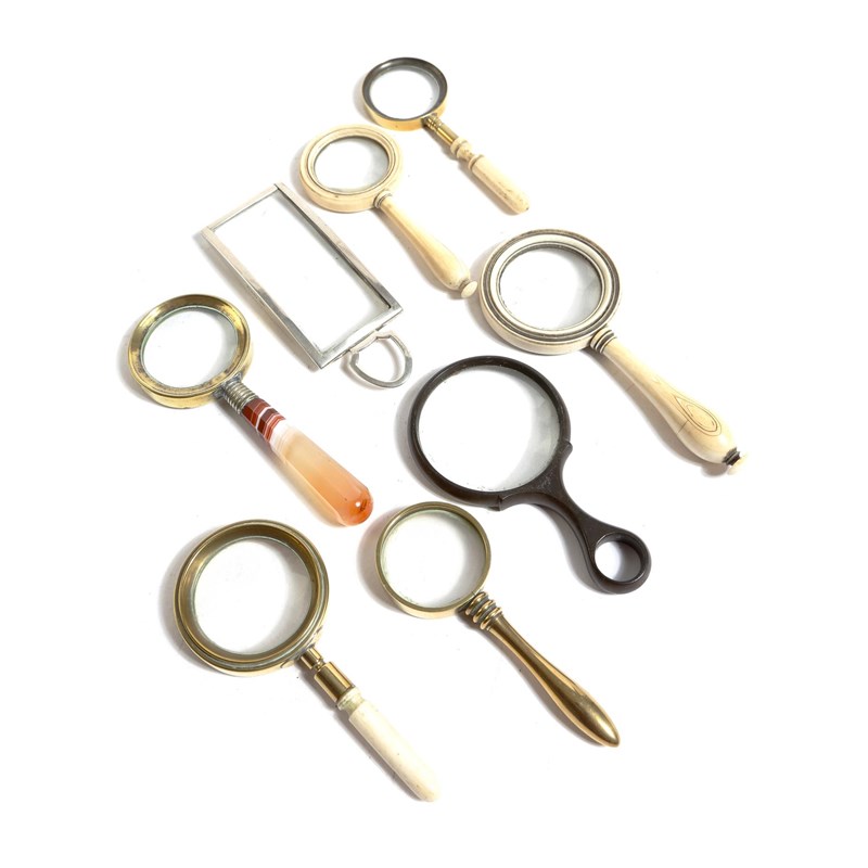 λ A small collection of magnifying glasses, including: a silver cased example, hallmarked Chester for Cohen & Charles, ivory and bone examples, one with an agate handle and a bakelite glass, 19th century and later, 12.5cm long (max). (8)