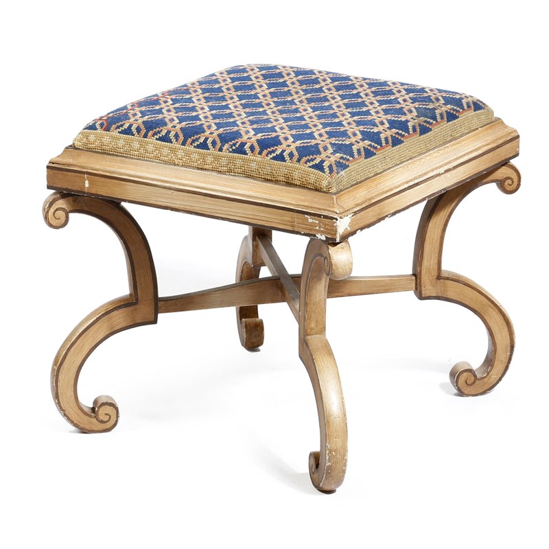 A 19th century painted wood stool, with a tapestry drop-in seat on scroll supports, 47.7cm high, 50cm wide, 51cm deep.