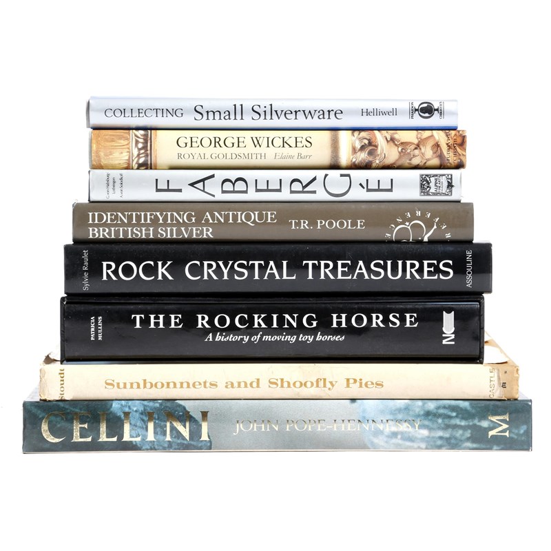 Literature. A quantity of books relating to silver and antiques, including: John Pope-Hennessy 'Cellini', Sylvie Raulet 'Rock Crystal Treasures', Stephen Helliwell 'Collecting Small Silverware', G. von Habsburg-Lothringen and A. von Solodkoff 'Faberge: Court Jewellers to the Tsars' and Patricia Mullins 'The Rocking Horse: A history of moving toy horses'. (A lot)