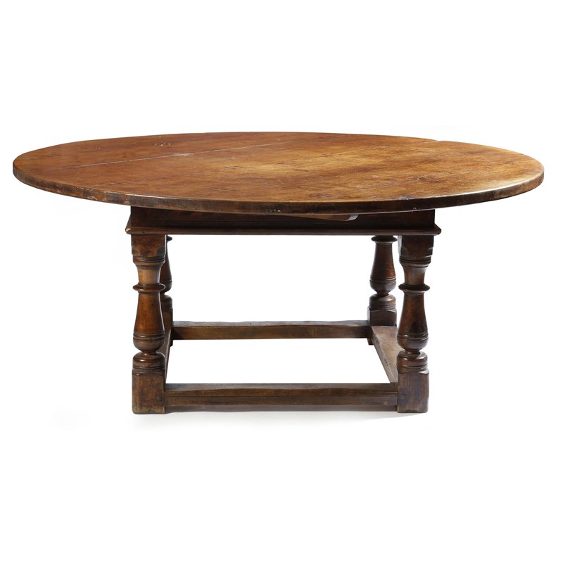 An oak dining table in 17th century style, the circular top above a parquetry decorated frieze, on baluster turned legs united by peripheral stretchers, 77.3cm high, 182.3cm diameter.