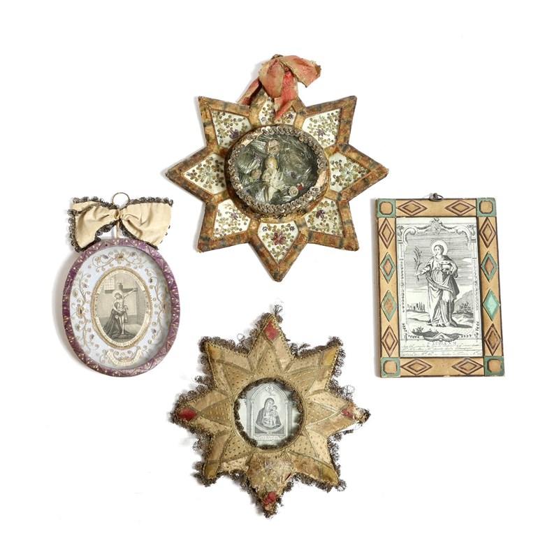 Four Portuguese Catholic devotional wall hangings, three decorated with needlework frames, one with paper scroll filigree decoration and devoted to Maria Do Lado, two of star shape, one decorated with spangles, the other with a painted card frame with an engraving of S. Luzia, probably late 18th / early 19th century, 24cm (max). (4)