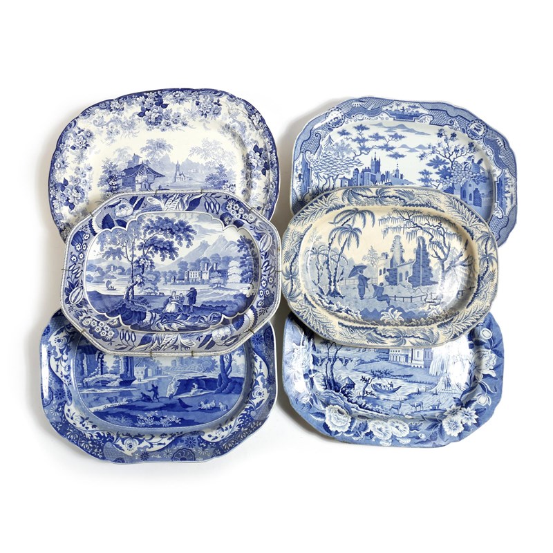 Six 19th century blue and white earthenware meat plates, two by Spode, one from the Caramanian series, one with a river view with buildings with minarets, 53.2cm wide. (6)