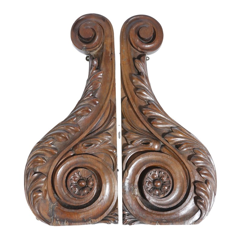 A pair of carved and stained pine scrolls, decorated with leaves and flowerheads, probably 19th century, 33cm high, 77cm wide. (2)