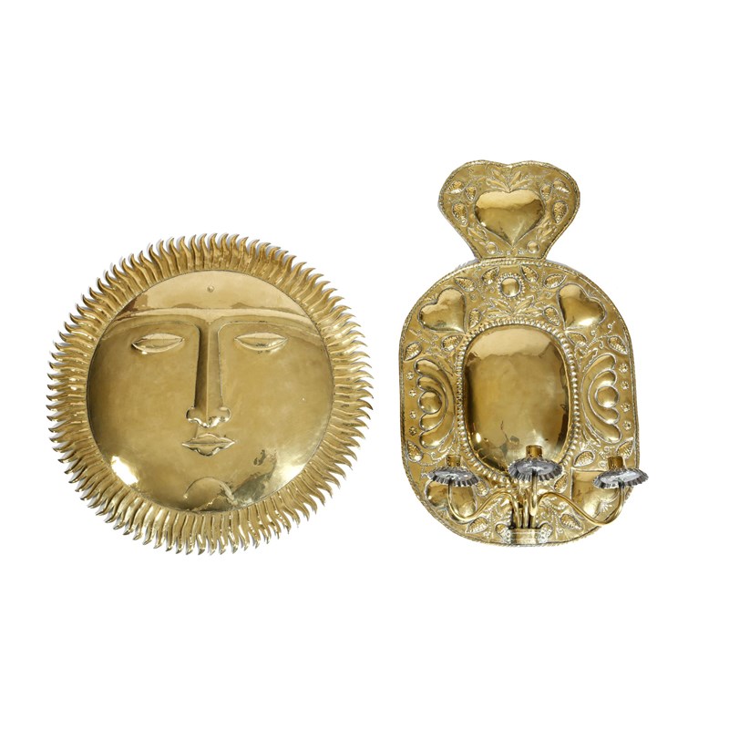 A 19th century Dutch brass three-light wall sconce, with repousse decoration, together with a Sri Lankan brass repousse sun plaque, 74cm high (max). (2)