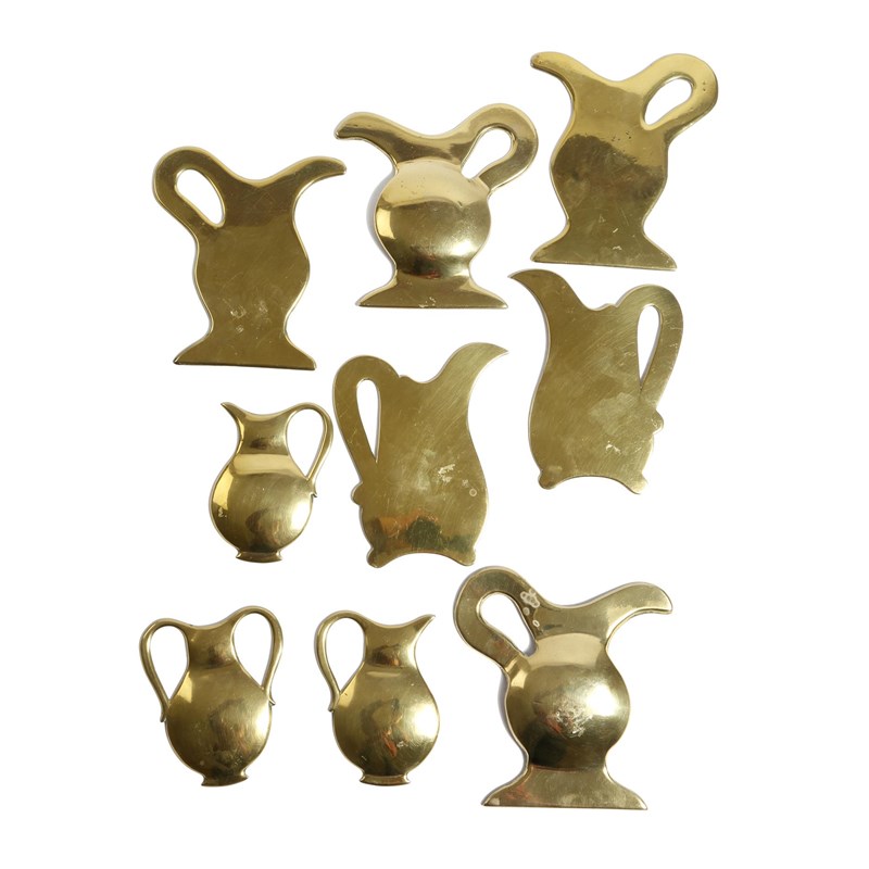 Nine Victorian brass flatback ornaments in the form of jugs and vases
