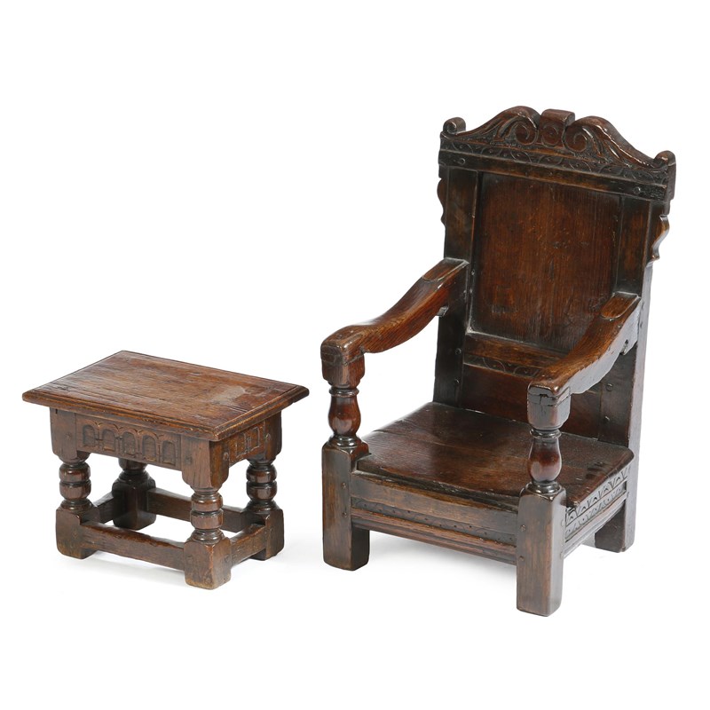 An oak child's panelled back armchair, with a scroll carved top rail, above a solid seat, possibly 17th century, 57.3cm high, 36cm wide, together with an oak child's stool. (2)