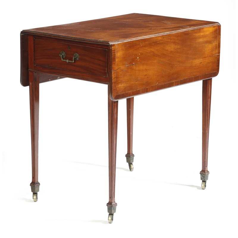 An early 19th century mahogany Pembroke table, the crossbanded drop-leaf top inlaid with stringing, above a frieze drawer to either end, one with divisions and fitted with a further drawer, on brass castors, 76.3cm high, 51.6cm wide, 74.6cm deep.