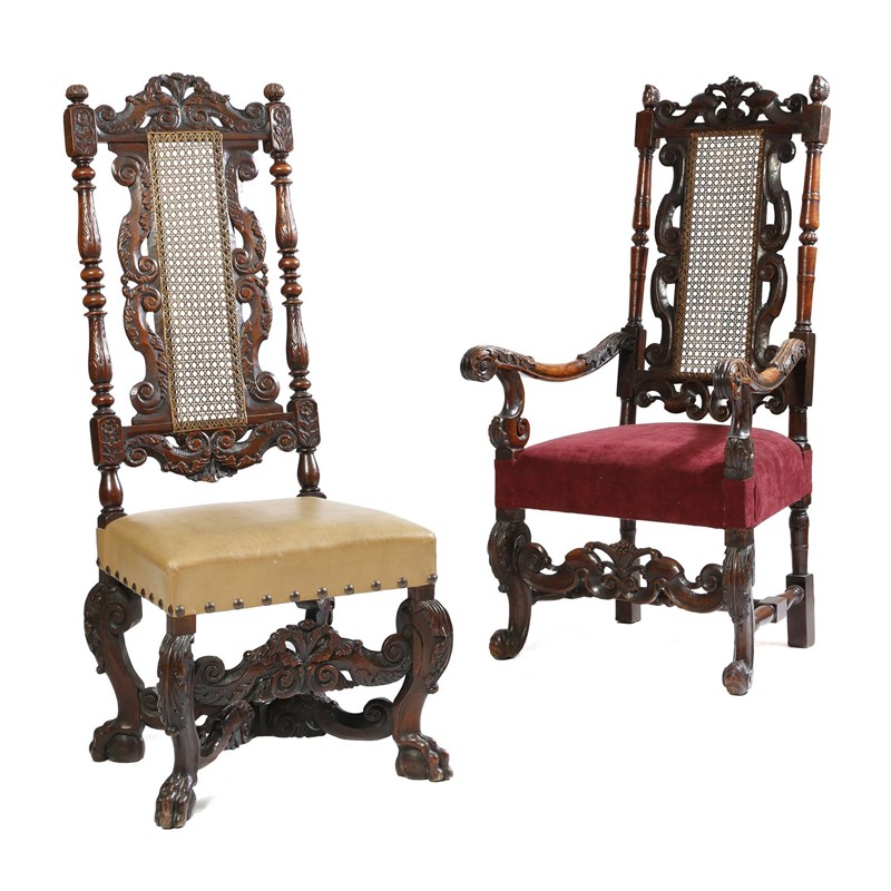 A walnut open armchair in 17th century style, the back carved with 'S' scrolls, with male head finials and with a cane panel back, with leaf carved arms, on conforming legs, united by a scroll stretcher, together with a similar side chair, on claw and ball feet. (2)