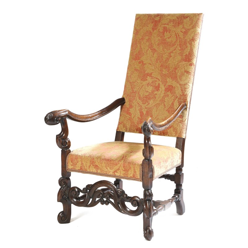 A walnut open armchair in late 17th century style, the padded back and seat upholstered with scrolling leaf damask fabric, with carved arms, above scroll cabriole legs united by stretchers, 19th century.