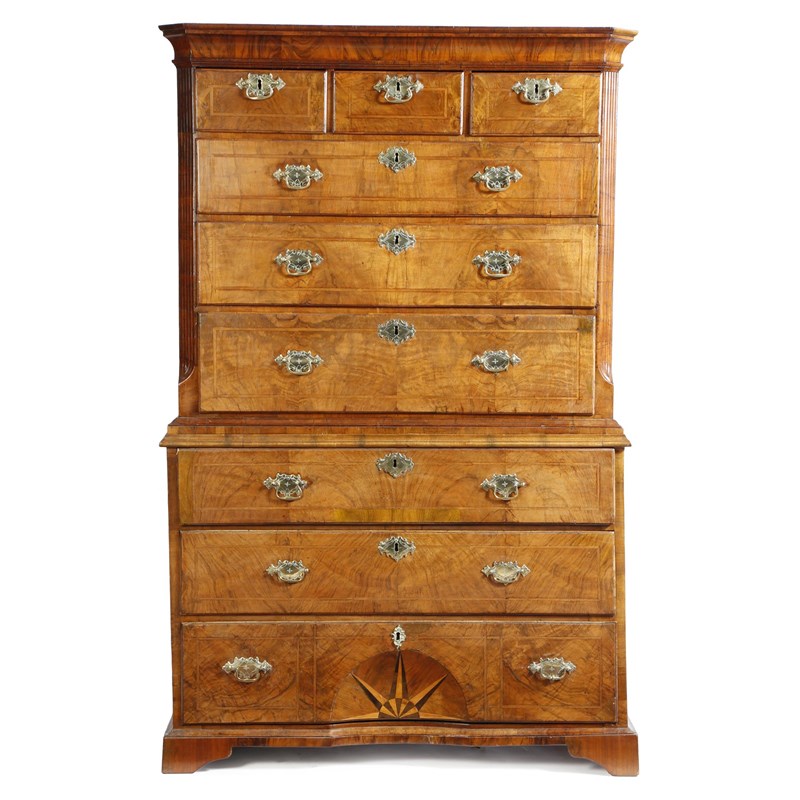 A George I walnut chest on chest, with three short and three long cross and feather banded drawers, flanked by fluted angles, the base with three long drawers, the lowest inlaid with a parquetry sunburst concave panel, on bracket feet, 164.2cm high, 105.3cm wide, 55.2cm deep.