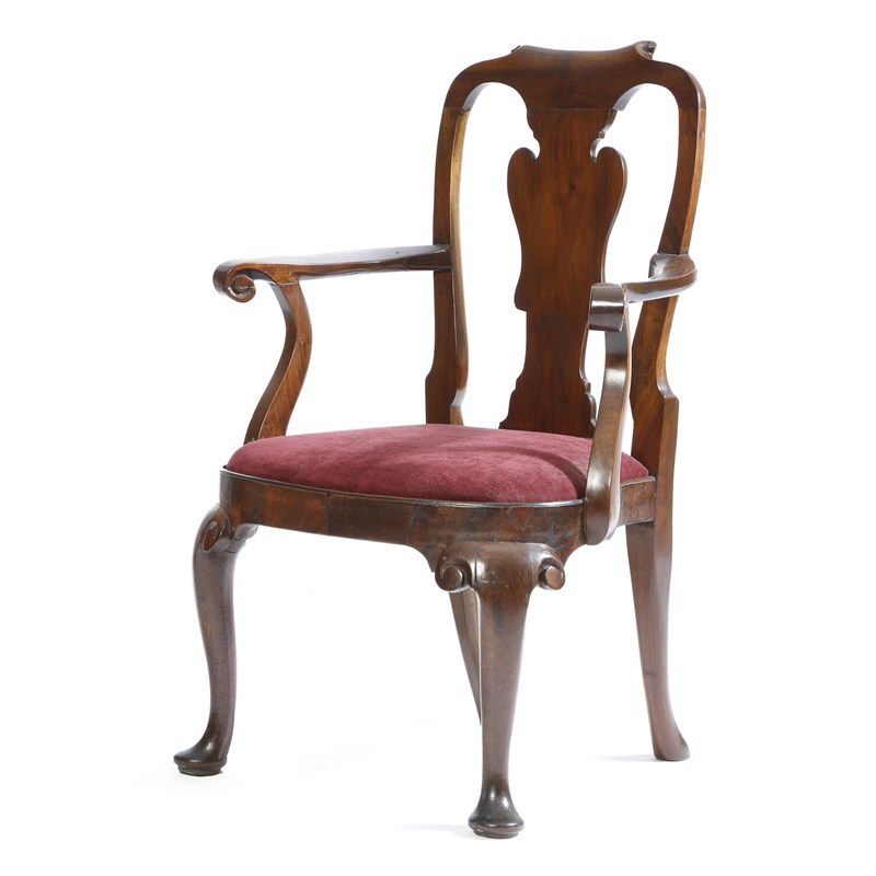 A George II walnut open armchair, with a solid splat and scroll arms, above a drop-in bell shaped seat, on scroll eared cabriole front legs and pad feet.