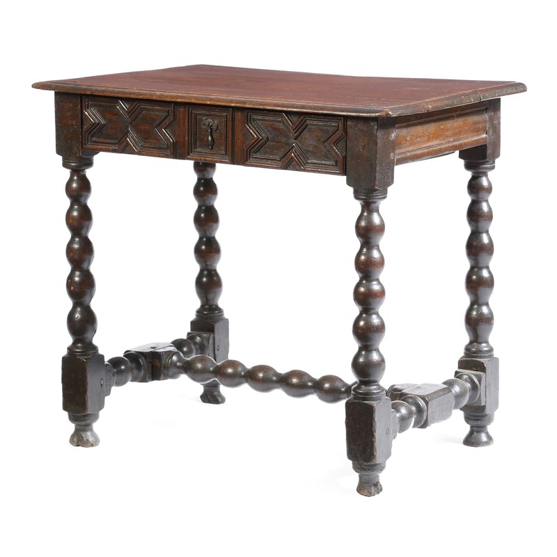 A William and Mary oak side table, the boarded top with a moulded edge, above a frieze drawer, with a geometric panelled front, on bobbin turned legs united by a central stretcher, 71.8cm high, 80cm wide, 55.2cm deep.