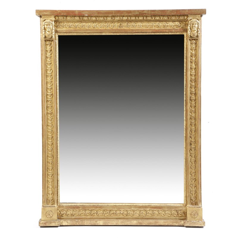 A Regency style giltwood wall mirror, the rectangular plate in a leaf moulded frame and with male mask capitals, 96.8 x 75.3cm.