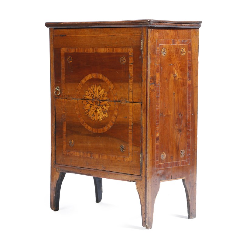 A late 18th century Italian walnut commodino, the formerly hinged top inlaid with banding and rondels, above a conforming cupboard door, marquetry inlaid with a foliate patera enclosing a shelf, 85.9cm high, 62.8cm wide, 33.7cm deep.
